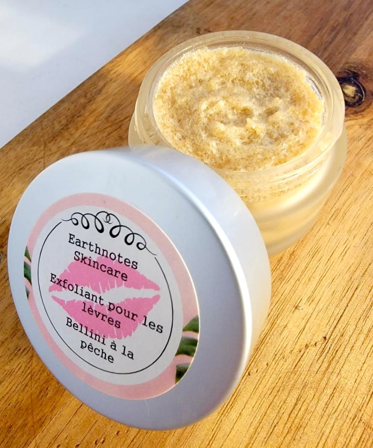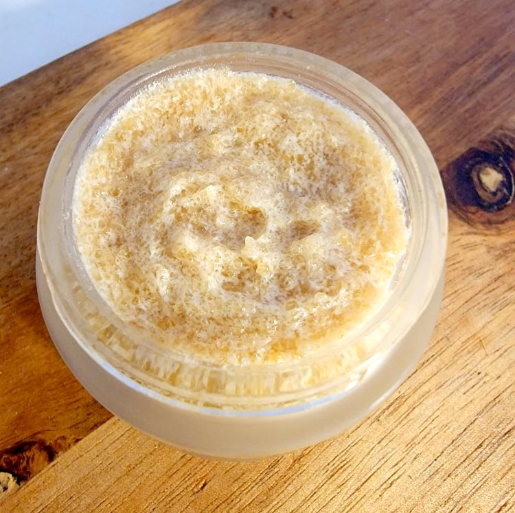 Ingredients: Turbinado Sugar, Cocos nucifera (Coconut) Oil, Salvia Hipanica (Chia) Butter, Aloe barbadensis leaf juice (Aloe Vera), Prunus armeniaca (Apricot) Oil, Vitis vinifera (Grapeseed) Oil, Simmondsia chinensis (Jojoba) Oil, Vegetable Glycerine, D-Alpha Tocopherol (Vitamin E), Flavor Oil
